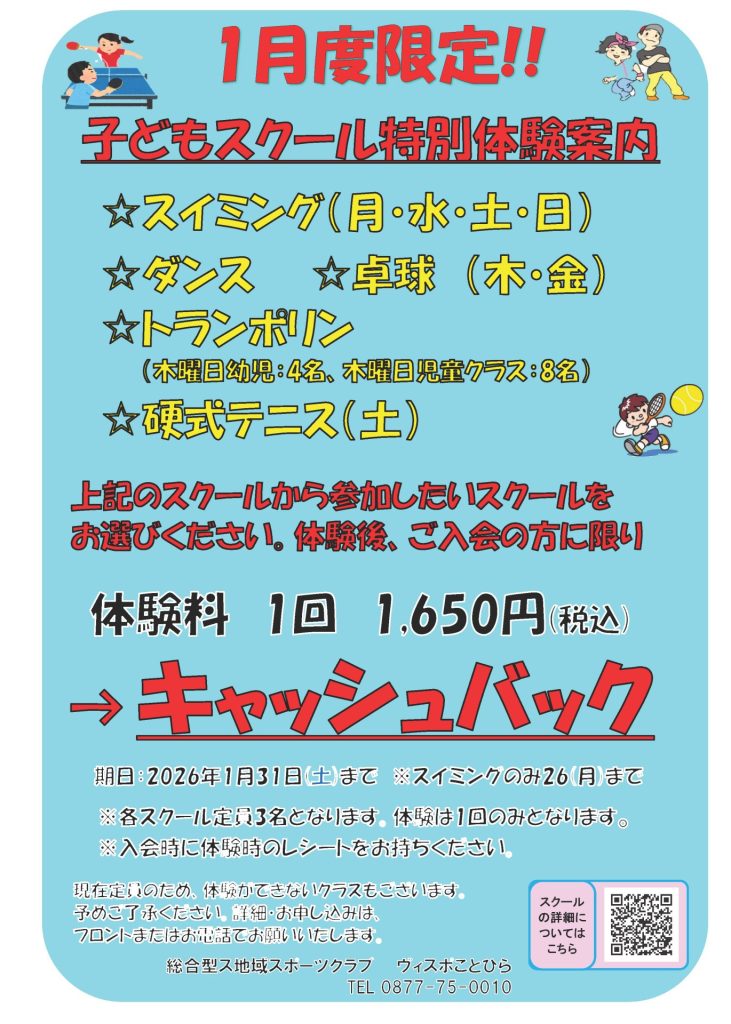 ヴィスポことひらでは、1月限定で子どもスクールの特別体験を実施します。